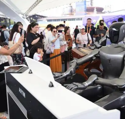 参展者在服贸会拍摄弹钢琴的人形机器人。2025年中国国际服务贸易交易会9月10日至9月14日在北京举办,众多科技产品亮相展区,吸引观